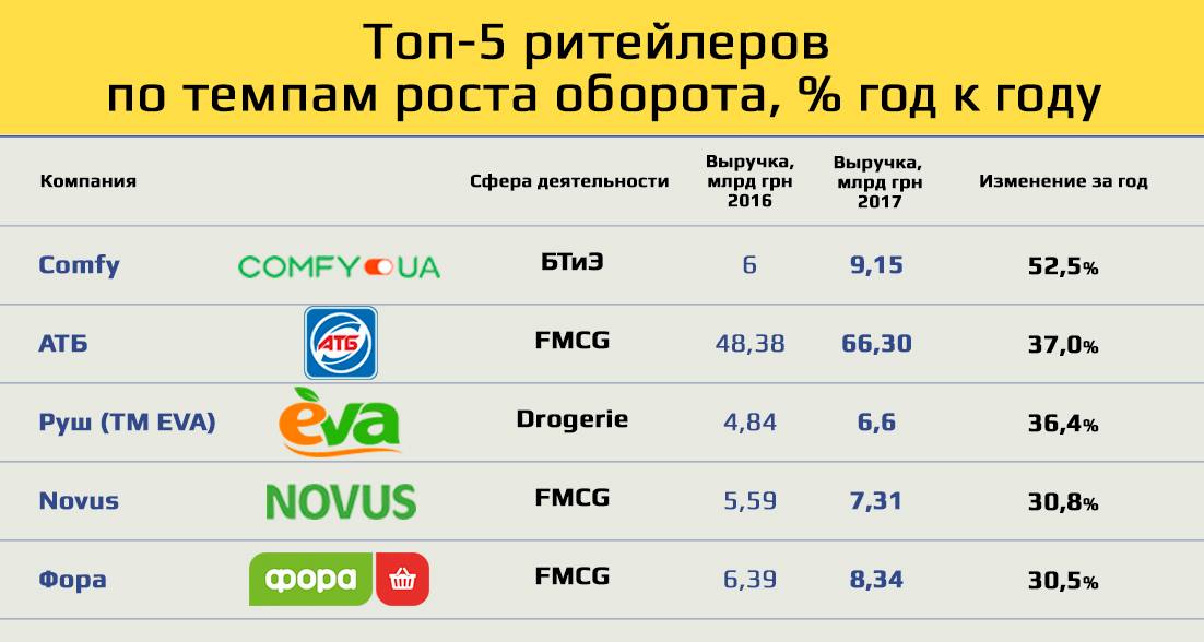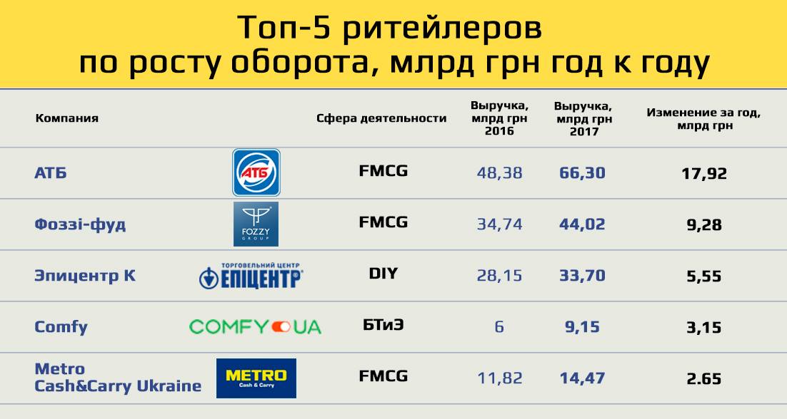На третьому місці – Епіцентр К, який збільшив виторг на 5,55 млрд грн (в 2016 році в порівнянні з 2015-м зміни становили ті ж 5,5 млрд грн, завидна стабільність), четверте місце посів Comfy, якому ривок в +52,5% до доходу забезпечив зростання виручки на 3,15 млрд грн. На п’ятому – Metro Cash & Carry Ukraine: завдяки зміни стратегії в Україні та впровадженню нового формату роботи німецька компанія наторгувала на 2,65 млрд грн більше, ніж у попередньому році.