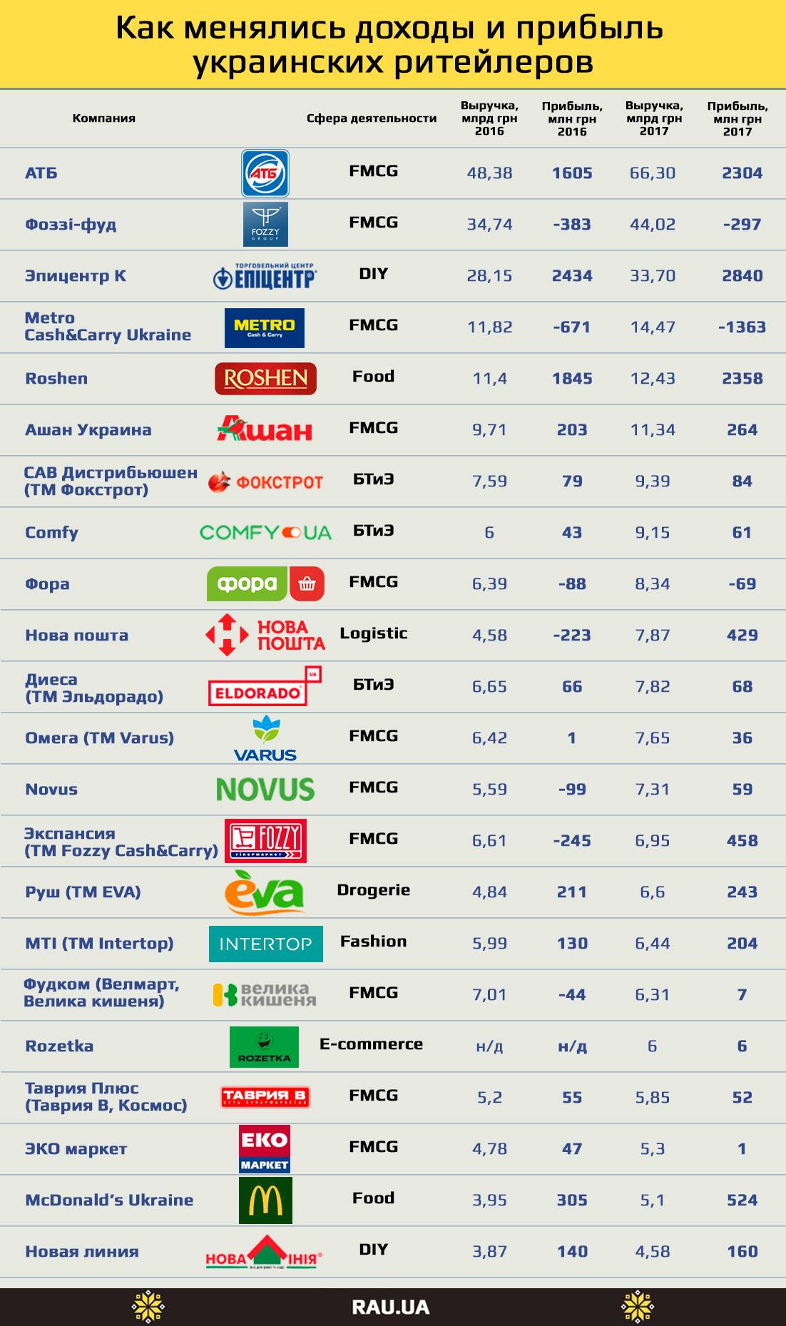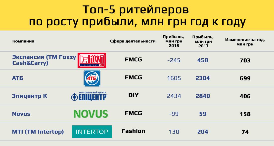 Але навіть позитивна динаміка обороту компаній далеко не завжди є гарантією їх фінансового благополуччя: найдохідніший рітейлер за підсумками звітного періоду може генерувати збитки, а мережі з порівняно скромними показниками – демонструвати відмінну рентабельність. Тому ми вирішили проаналізувати: які компанії закінчили 2017 рік з найбільшим прибутком, а які так і не змогли вийти «в плюс».