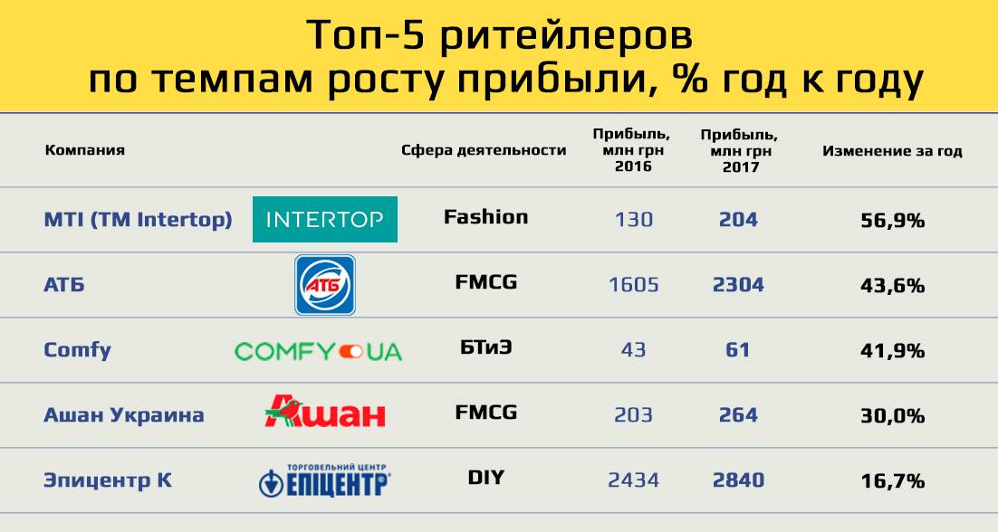 Але в процентному співвідношенні найактивніше ріс єдиний fashion-рітейлер в топ-200 – Intertop. Компанія зуміла більш ніж в півтора рази збільшити чистий прибуток – на 56,9%, до 204 млн грн. Також хороші показники в відсотках у АТБ, Comfy і Ашан Україна. Епіцентр наростив прибуток на 16,7%.