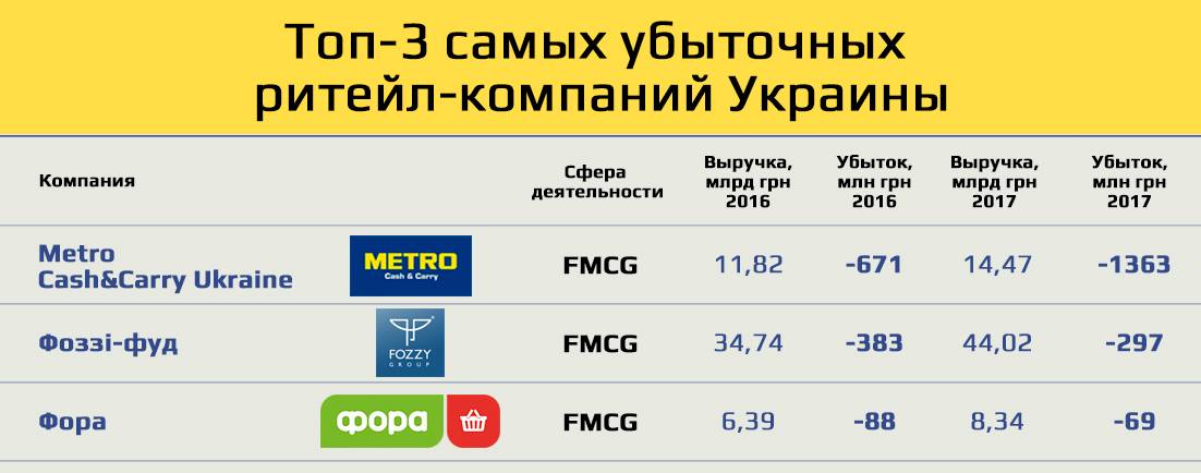Схожа ситуація і в Metro Cash & Carry Ukraine. Тільки хронічна збитковість компанії пов’язана не з великим кредитним навантаженням, а з особливостями фінансового обліку міжнародних корпорацій, списанням втрат в Донецьку і Луганську, що триває, і переоцінкою активів. Збитки Metro Group в Україні по роках: 2017-й – 1363 млн грн, 2016-й – 671 млн грн, 2015-й – 2001 млн грн, 2014-й – 1969 млн грн.
