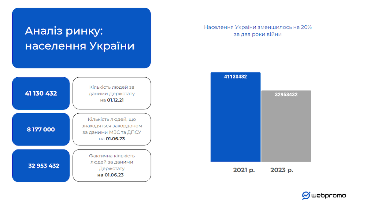 Після початку повномасштабного вторгнення населення України за даними Держстату, зменшилося на 20%. Також спостерігається значна міграція населення в межах України: станом на травень 2024 року, в Україні зареєстровано понад 4,7 млн внутрішньо переміщених осіб (ВПО). Тенденції на збільшення кількості населення не спостерігається: згідно з прогнозами МВФ, чисельність населення України до 2028 року зросте лише до 36 млн.