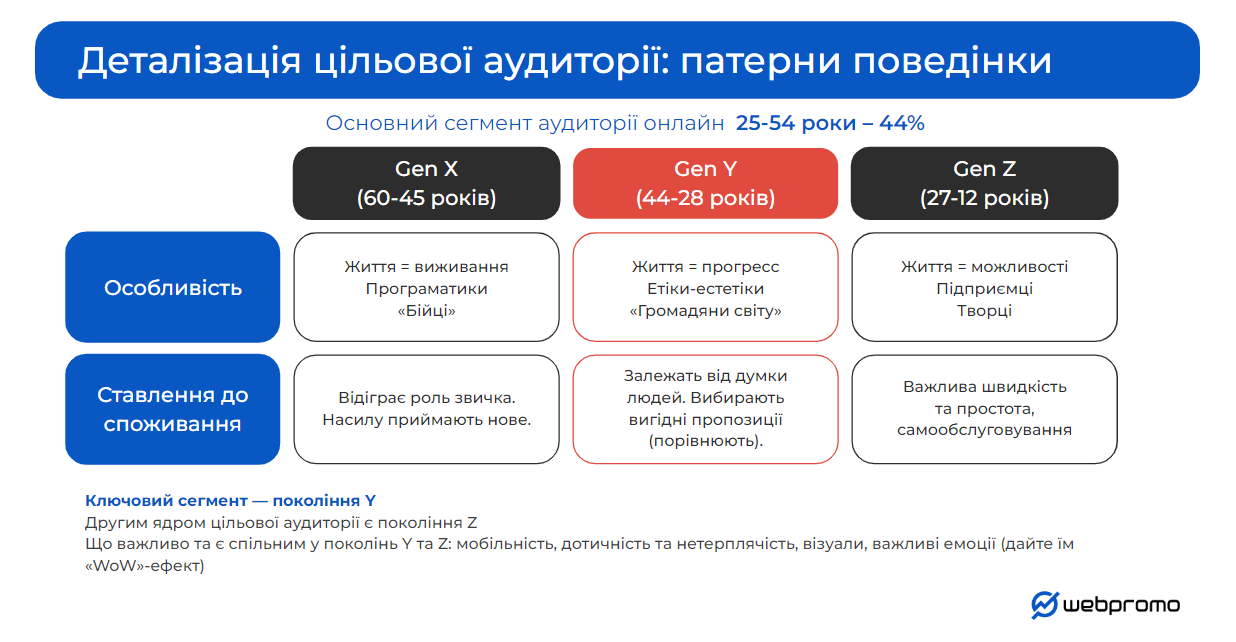 - Другий сегмент, менший за обсягом, але не менш диджиталізований — покоління Z (12-27 років). Вони цінують швидкість та простоту, з часом їхня купівельна спроможність зростатиме.