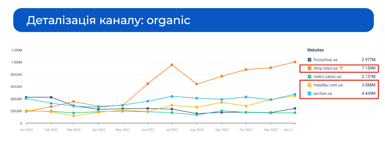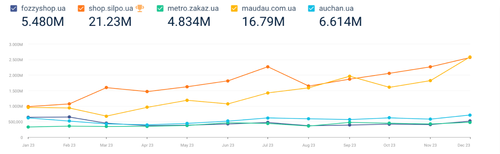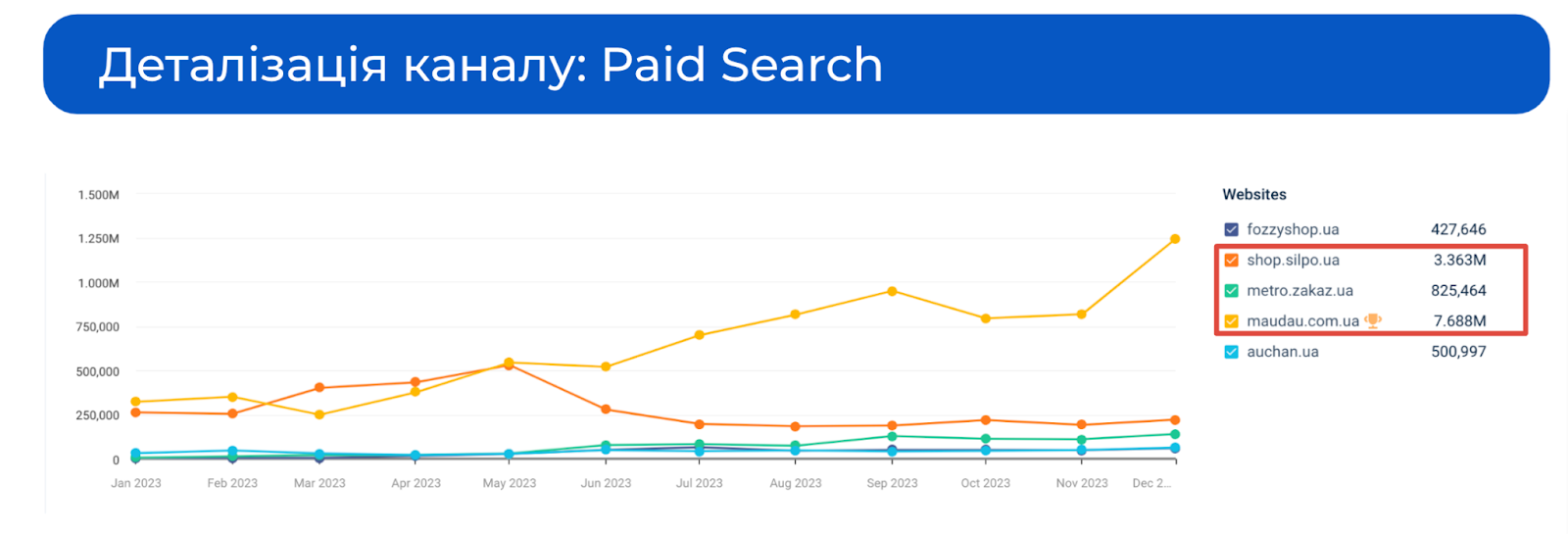 Лідерами у ніші за обсягом платного пошукового трафіку є Сільпо та MauDau: