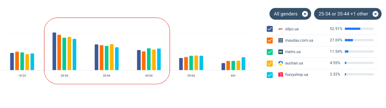 - аудиторія 45-54 років відвідує сайти Fozzy та Metro (MauDau та Сільпо мають меншу долю, яка більша за обсягом).