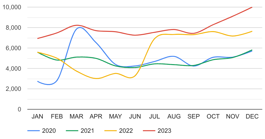 В онлайн обсяг пошукових запитів у категорії зріс на 21% в порівнянні з 2022 роком і продовжує демонструвати стрімке відновлення ― у IV кварталі 2023 року попит зріс на +20,25% відносно попереднього кварталу.