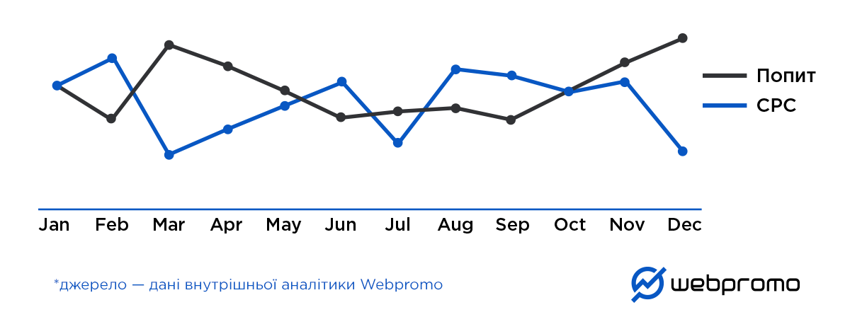 На вартість СРС впливає кількість гравців на ринку (пропозиція). Бачимо, що СРС у грудні дешевший, адже попит зростає так динамічно, що активностей рекламодавців може бути недостатньо для його повного покриття.