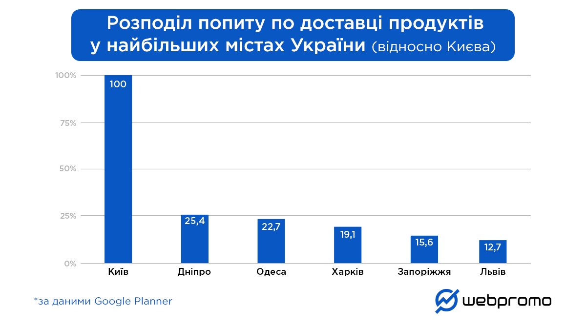 *розподіл попиту по доставці продуктів у найбільших містах України відносно Києва за даними Google Planner