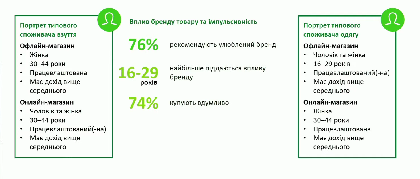 Хоча частка чоловіків і жінок, які купують одяг в традиційних магазинах, однакова (94%), чоловіки частіше роблять покупки протягом місяця і витрачають на 37% більше на одну покупку, ніж жінки. Зате жінки частіше прислухаються до порад консультантів.