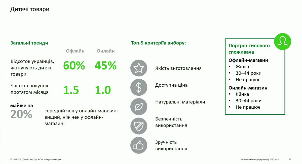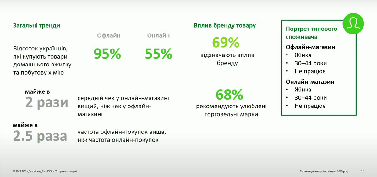 В даному сегменті жінки частіше ходять у звичайні магазини, а чоловіки витрачають в середньому на 250 грн більше. В цілому через офлайн і онлайн-канали купують 60% і 45% опитаних відповідно. Середній чек вище в інтернеті на 20%.