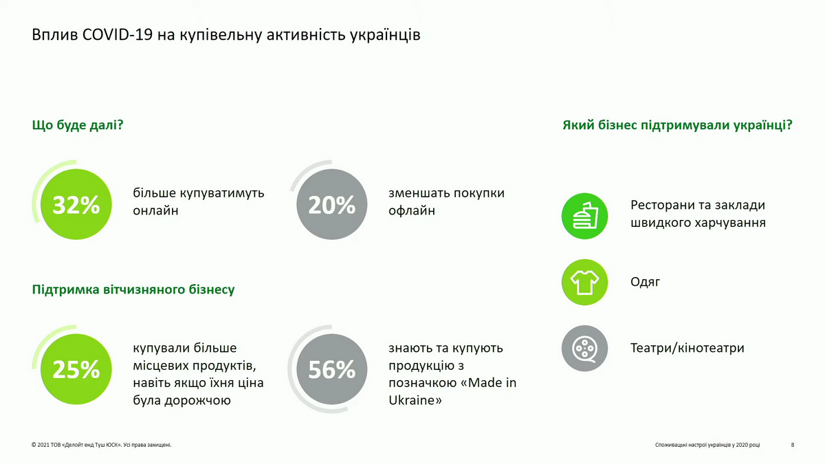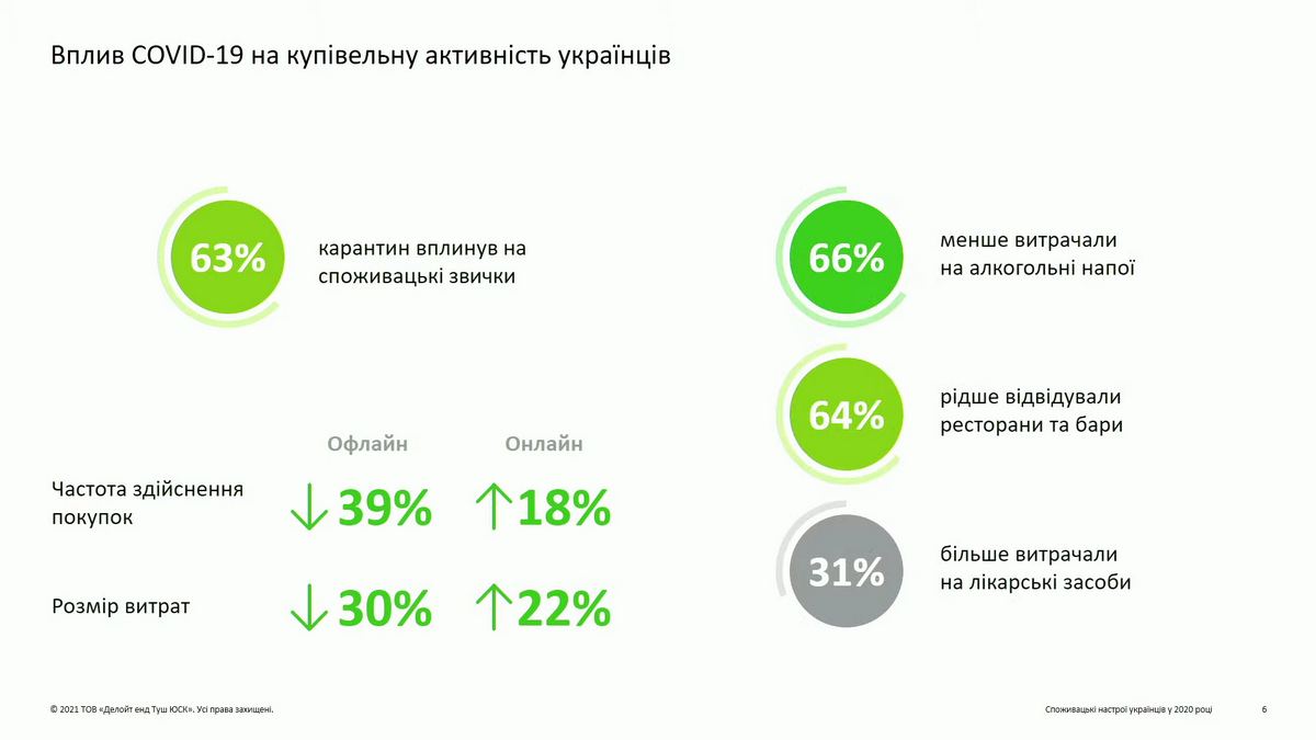Так, майже 40% респондентів відзначили зниження частоти покупок в традиційних магазинах, але тільки 18% стали частіше купувати в інтернеті. Аналогічно витрати в звичайних магазинах скоротили 30% опитаних і лише 22% стали витрачати більше в інтернеті.