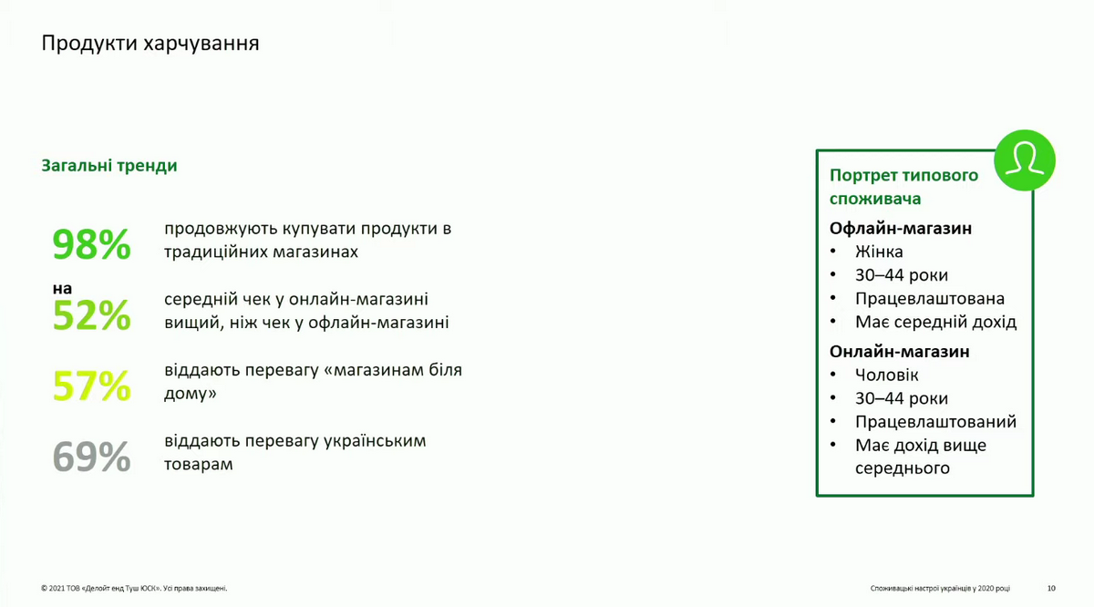 Представники компанії Deloitte презентували результати свого дослідження “Споживчі настрої українців у 2020 році”, проведеного в грудні минулого року. Дослідники поставили собі за мету з’ясувати, як і де українці вибирали товари десяти основних категорій. Олександр Ямпольський, керівник галузевої групи з рітейлу й оптової дистрибуції та Ольга Шамрицька, партнер з аудиту компаній галузі рітейлу та оптової дистрибуції Deloitte в Україні попросили представників рітейлу порівняти дані опитування з реальною картиною продажів по п’яти найбільш затребуваним категоріям. RAU пропонує ознайомитися з основними тезами дослідження і цієї бесіди.