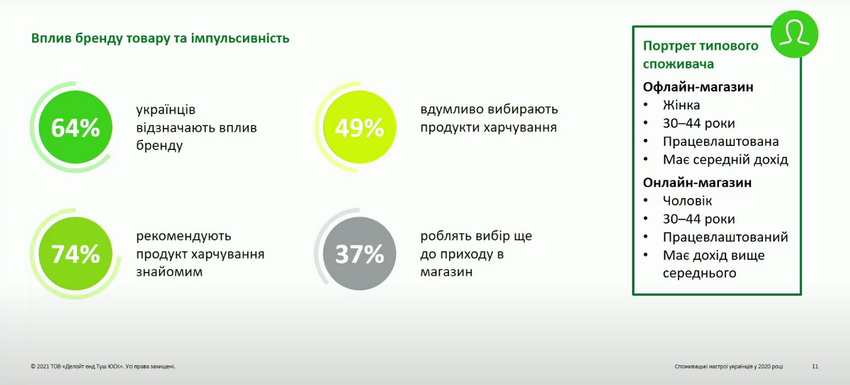 Характерним маркером поведінки українських споживачів також є «брендозалежність». Практично у всіх категоріях товарів бренд в значній мірі впливає на остаточний вибір. У тому числі тому, що люди не бажають ризикувати грошима при покупці у невідомих виробників. Українці охоче рекомендують друзям і знайомим свої улюблені бренди. Правда, і тут є нюанси. Наприклад, тільки 18% довіряють рекомендаціям друзів при купівлі побутової техніки і лише 7% – порадам продавців.