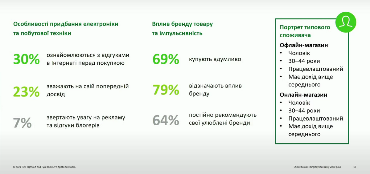 «Ринок техніки й електроніки виріс за рік на 20% в грошовому еквіваленті. Ми конкуруємо за гаманці споживачів із сектором розваг і подорожей, доступ до яких був обмежений в 2020 році. Свою роль також зіграла велика частка продажів в кредит, що сильно відрізняє наш ринок від Польщі та інших країн Східної Європи, де більше поширені різні акції і знижки», – пояснила Наталія Кошова.