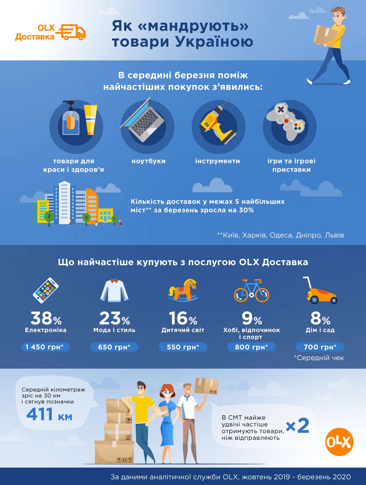 В середньому посилки проїжджають 411 км, що на 8% більше, ніж пів року тому. В СМТ удвічі частіше отримують товари, ніж відправляють. За березень кількість доставок у межах 5 великих міст України збільшилася на 30%. Чим живе онлайн-торгівля в Україні — в аналітиці OLX за жовтень 2019 — березень 2020.