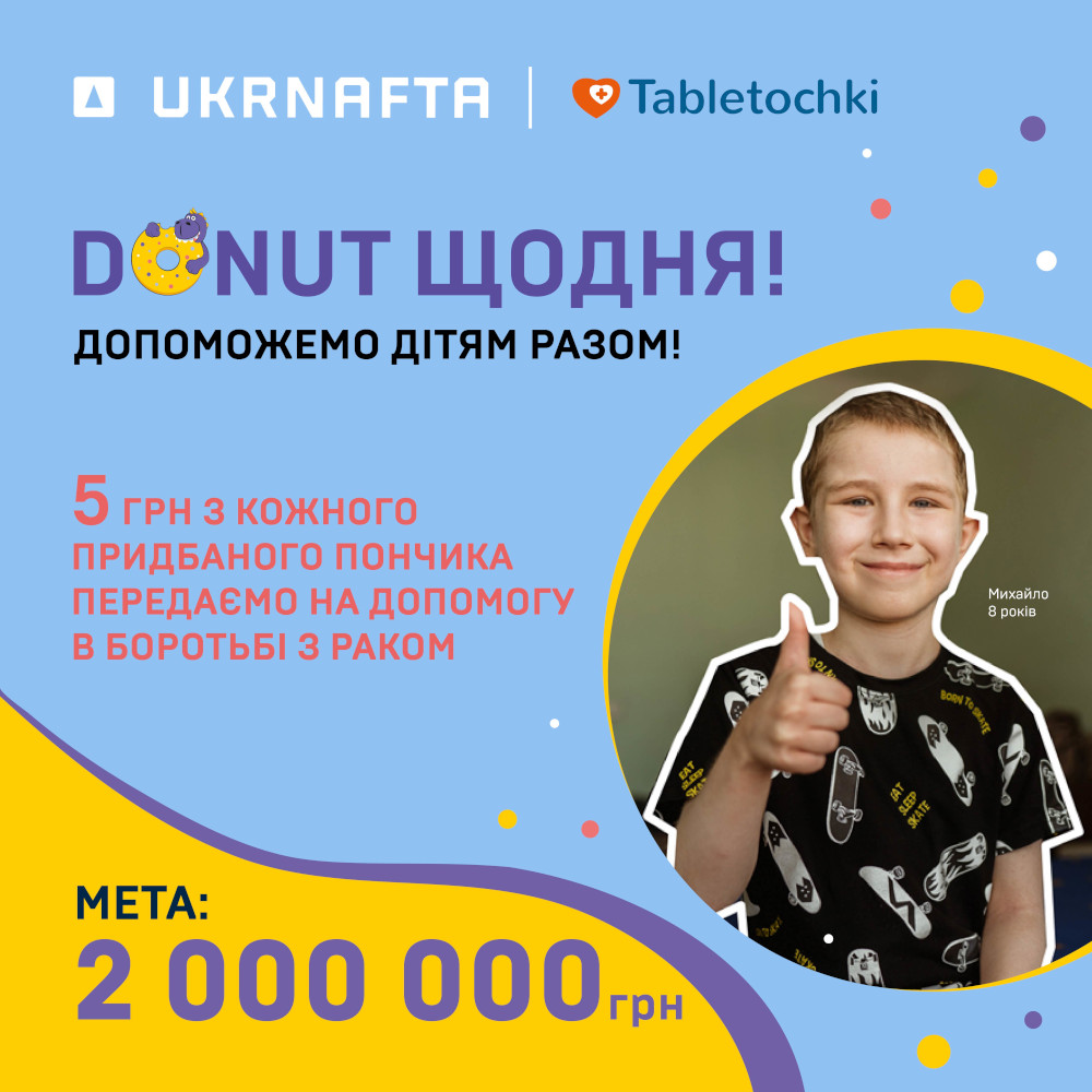 Ukrnafta підтримує тільки перевірені благодійні організації, і фонд «Таблеточки» — один із них. Суть спільного проєкта – з продажу одного пончика 5 грн перераховуються в БФ «Таблеточки» на допомогу онкохворим дітям. Мета – зібрати 2 млн грн.