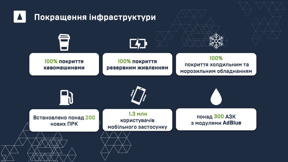 Покращення інфраструктури включає багато невидимих для клієнта деталей, які є основою для ефективної роботи: мобільний додаток, наявність генераторів, нові паливороздавальні колонки (ПРК), холодильне обладнання тощо. Ці елементи були відсутні в мережі і є базою для подальших оновлень.