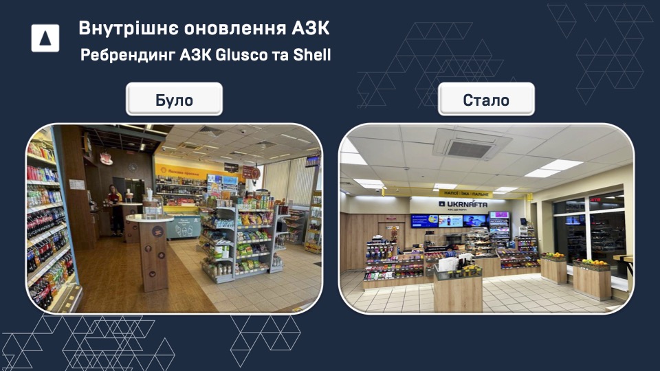 Також паралельно відбувається ребрендинг та приведення до стандартів дизайну Ukrnafta АЗК Glusco та Shell. Крім того, наша мережа має кілька унікальних об’єктів, які мають хороший потенціал та можуть стати магнітом для клієнтів. Зараз триває оновлення цих АЗК в особливому унікальному форматі. Сподіваюсь, що незабаром ми зможемо розповісти про їх запуск, перші результати та клієнтський досвід.
