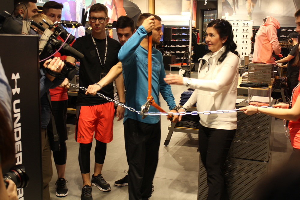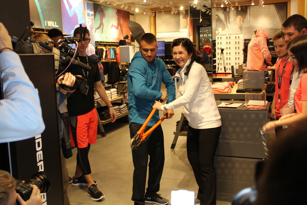 Саме Василя і попросили розрізати суворий замінник традиційної червоної стрічки: сталевий ланцюг. Що боксер успішно і зробив. За допомогою генерального менеджера Under Armour в Україні та Казахстані Клари Айсвірт.