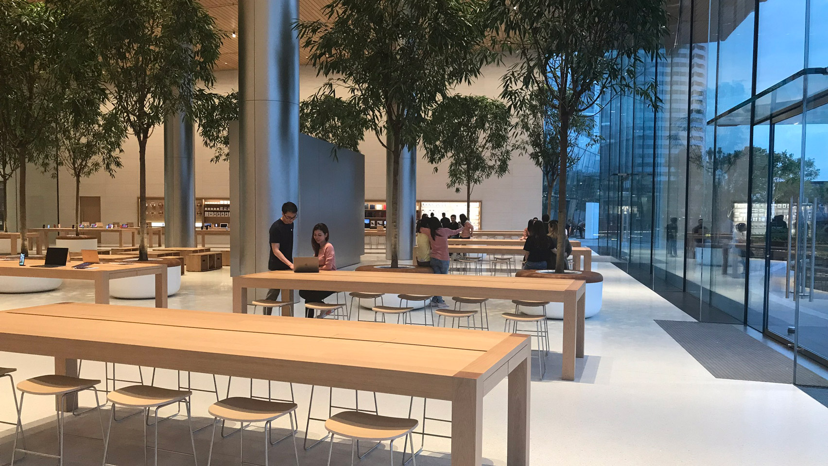 Яскравим прикладом розкриття унікальності бренду в інтер’єрі можна вважати бутік Apple Iconsiam, відкритий в 2018 році в столиці Таїланду – Бангкоку. Дизайнери спроектували магазин таким чином, щоб межа між інтер’єром і зеленою площею зовні була практично непомітною. Так, за скляним фасадом торгового центру знову ростуть дерева, а покрівлю, оброблену деревиною, підтримують тільки 4 колони в центральній частині залу, створюючи приємне відчуття простору. Знамените “надкусане яблуко” є основним елементом, який привертає увагу відвідувачів бутіка. В якості меблів використовуються вироби з натурального дерева, які за формою дуже нагадують ноутбуки американського виробника.