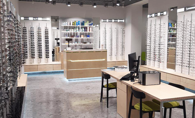 Територія магазину складає 90 кв. м і для максимальної зручності клієнтів розділена на чотири зони: кабінет лікаря, кабінет майстра-оптика, окремі зони сонцезахисних окулярів та оправ.
