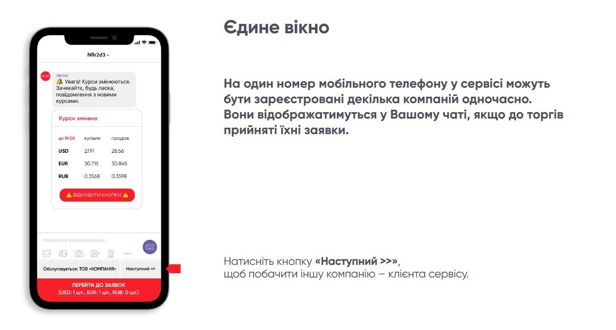 Ще одна перевага – в одному чаті можна оформляти угоди від імені різних юросіб. Це корисно для бізнесменів, у яких кілька компаній, що працюють з купівлею-продажем валюти. При цьому, для користувачів месенджера, щоб мінімізувати плутанину, доступна можливість перемикання між окремими компаніями, що виконується дуже просто – буквально одним натисканням на екран.