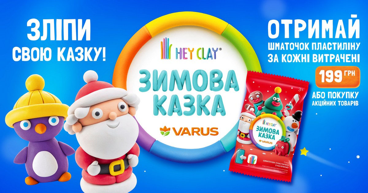 Під час акції у супермаркетах мережі можна буде придбати саше зі шматочками пластиліну HEY CLAY. Усередині кожного — пластилін одного з 18 яскравих кольорів для створення казкових персонажів. Щоб отримати сашет за акційною ціною 3,99 грн достатньо придбати у Varus товарів на 199 грн. Крім того, барвисті пакуночки також можна отримати за купівлю товарів-партнерів акції.
