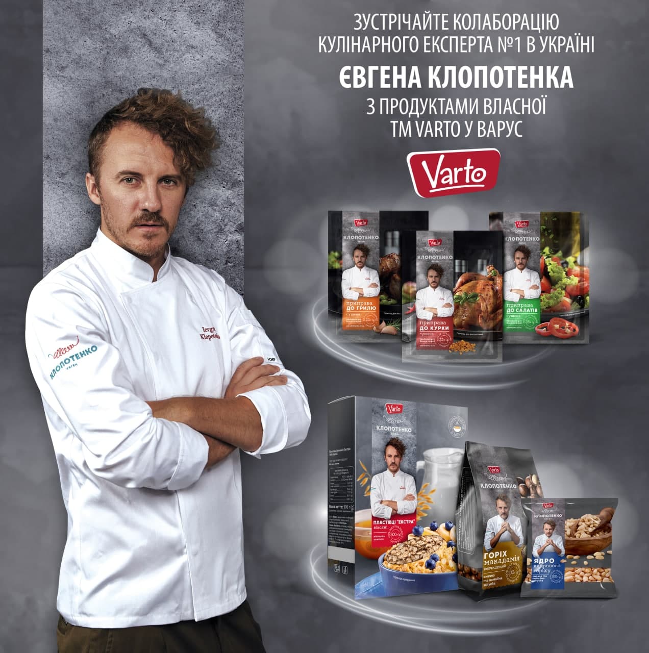 Мережа супермаркетів Varus вже представила першу ексклюзивну лінійку продуктів ТМ VARTO, розроблених у співпраці з Євгеном Клопотенко. У продажу з’явилися спеції, вівсяні пластівці, горіх макадамія, кедровий горіх, пекарські папір і фольга. Покупець легко ідентифікує дану продукцію – в новий дизайн упаковки продуктів ТМ VARTO інтегрований впізнаваний образ кулінарного експерта і візуальні атрибути бренду. У цьому дизайні будуть виконані і всі наступні новинки ТМ VARTO.