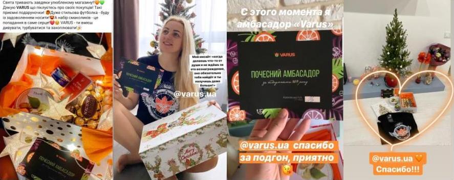 Протягом новорічних свят ряд клієнтів VARUS поділилися у Facebook та Instagram фотографіями подарунків отриманих від мережі. Крім святкового набору продуктів, у коробочці ще був диплом Амбасадора і стильна брендована футболка.