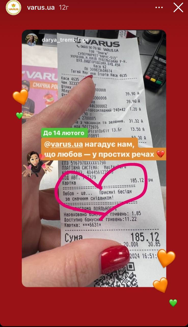 Останні два тижні в чеках мережі Varus з’являлись милі нагадування про те, що: “Любов це… коли ви різні за смаками, але разом ідеальне поєднання”, “Любов це… приємні бесіди за смачним сніданком”. Клієнти ділились фото чеків у соціальних мережах і відмічали своїх коханих.
