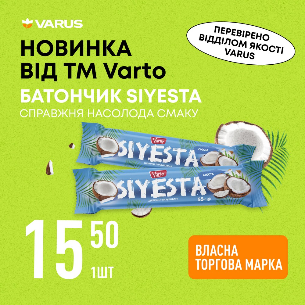 Асортимент власних торгових марок Varus постійно поповнюється новими товарами та смаками, щоб задовольнити запити усіх клієнтів мережі. Батончик Siyesta ТМ Varto — це новинка, створена спеціально для тих, хто полюбляє солоденьке, а особливо батончики знайомих смаків.