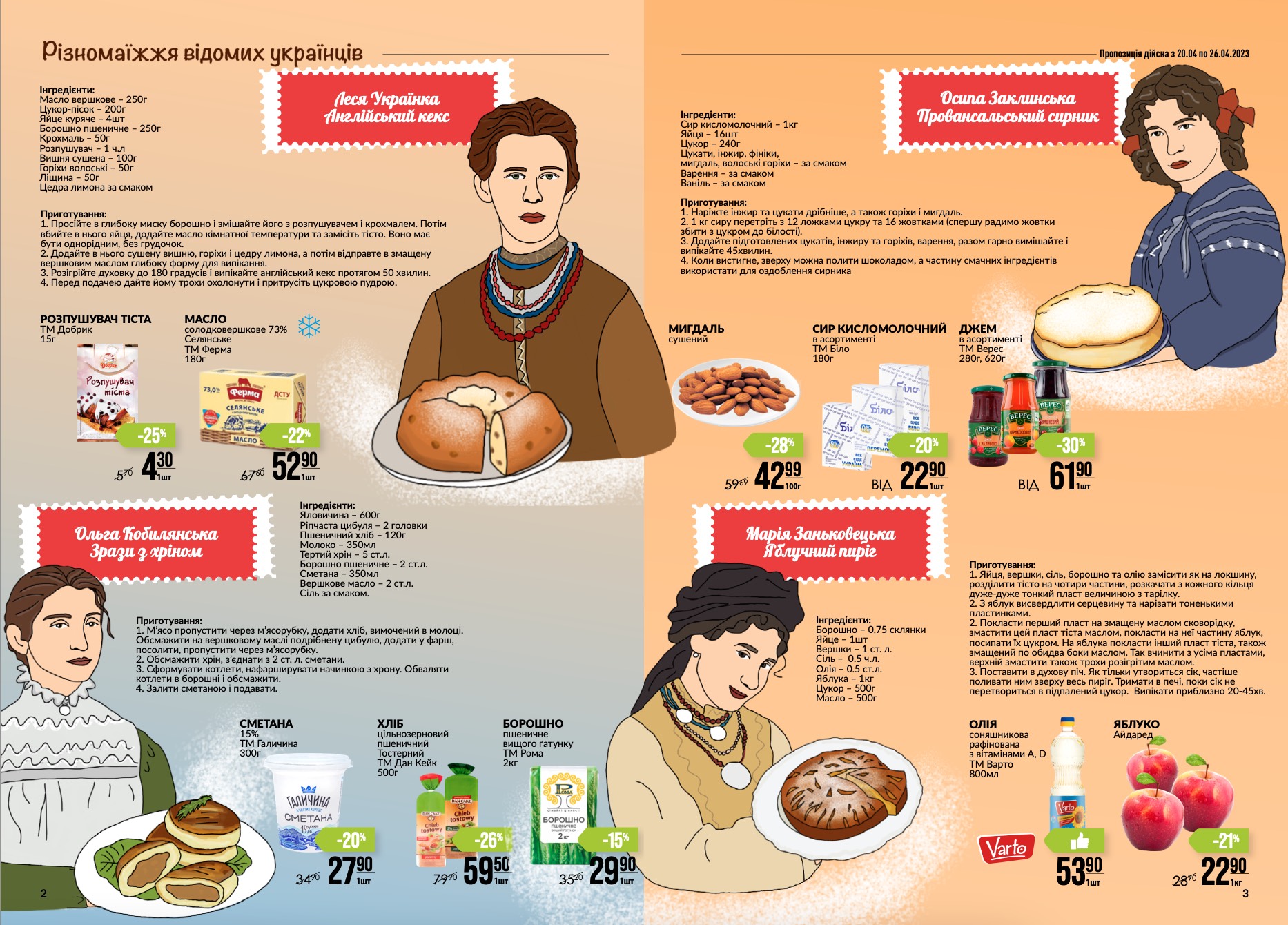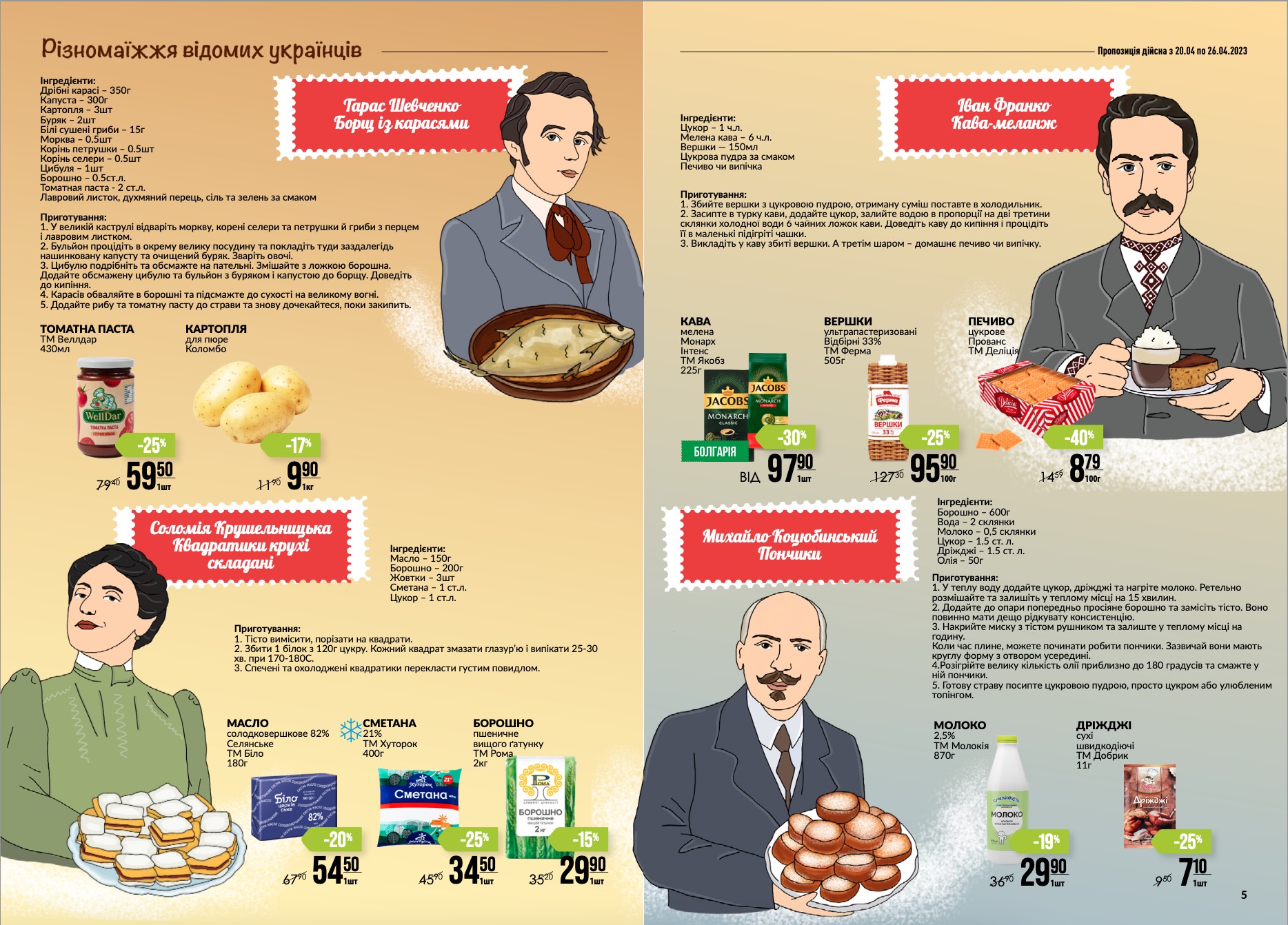 Окрім того, в добірку рецептів від Varus увійшли: улюблений борщ Тараса Шевченка; пончики, якими смакував Михайло Коцюбинський; англійський кекс, який дуже подобався Лесі Українці; квадратики крухі з особистого кулінарного записника Соломії Крушельницької; провансальський сирник із книги «Нова кухня вітамінова» Осипи Заклинської.