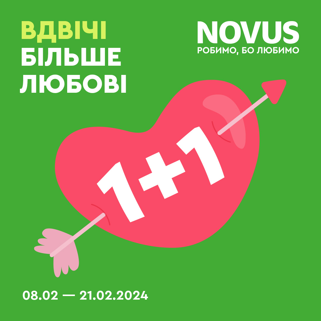 У магазинах Novus розпочалася акція 1+1, тож до 21 лютого можна обрати два однакових акційних товари, а заплатити тільки за один. Другий – коштуватиме лише десять копійок.