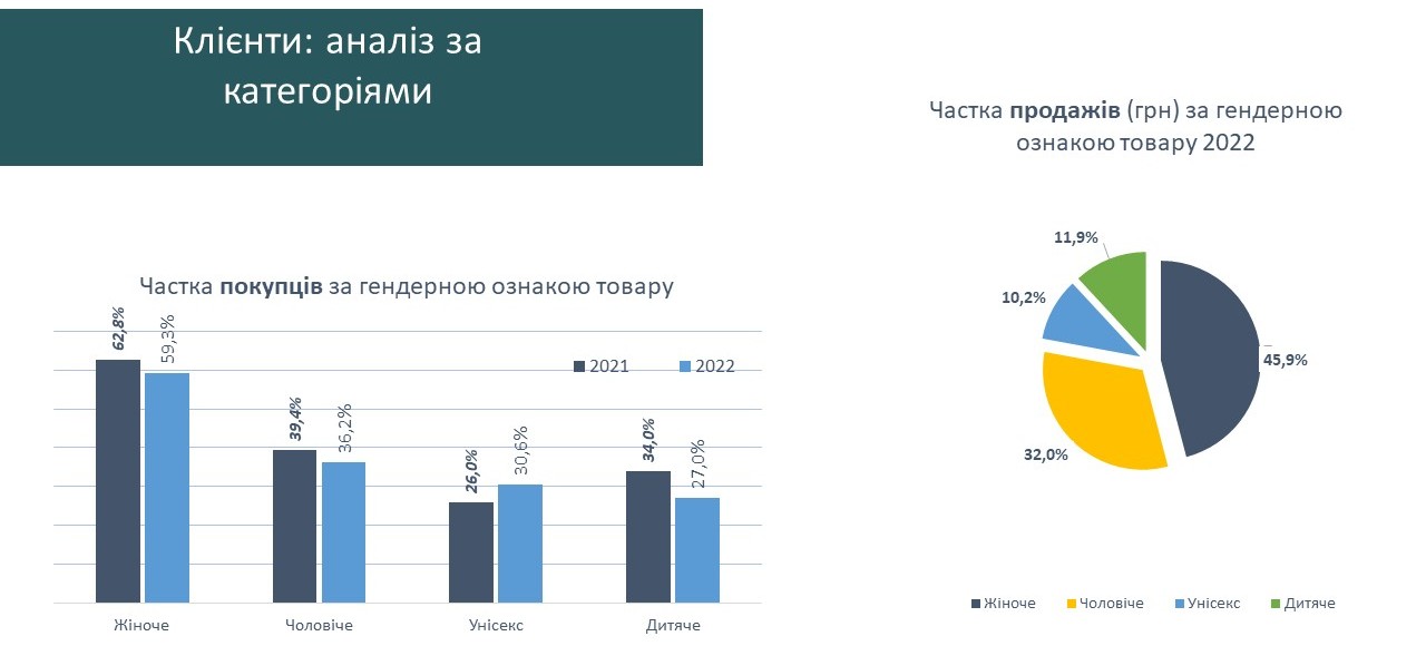 Топ-5 областей за продажами у I кварталі: Київська (53%), Дніпропетровська (9%), Львівська (9%), Одеська (7%), Черкаська (2%). Значно змінилися наші продажі також за гендерною ознакою. Чоловіча категорія зросла у продажах на 4%, товари жіночого та дитячого сегментів, через виїзд цієї ЦА з країни, – зменшилася.