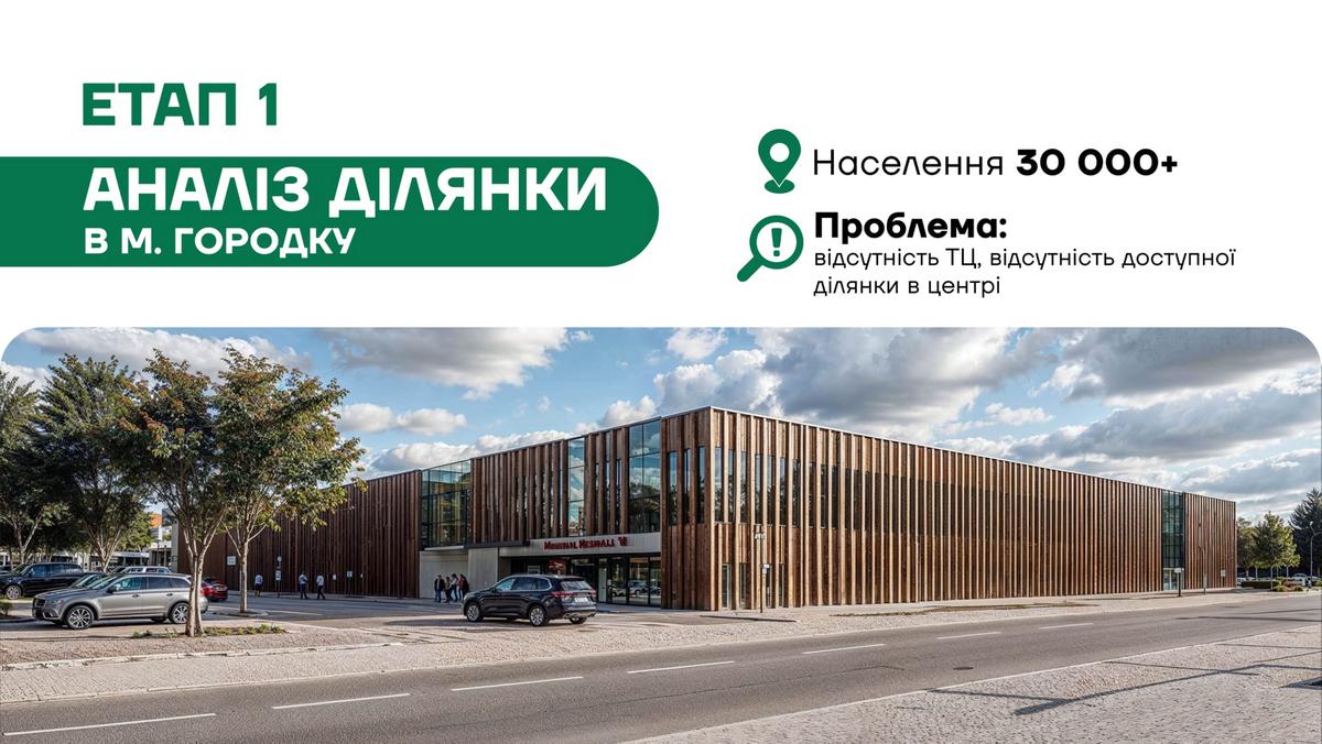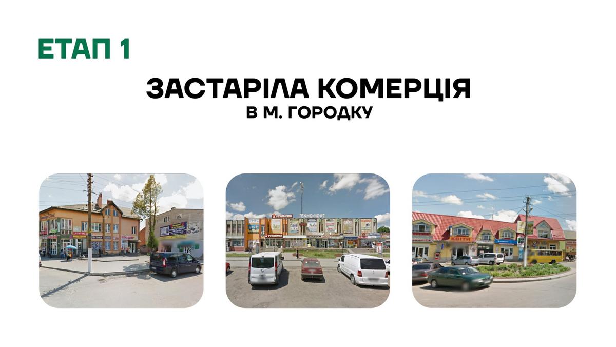 Цей процес гарно ілюструє приклад по майбутньому ТЦ в місті Городок Львівської області, де центр міста щільно зайнятий успішними об’єктами комерції, нехай і застарілого формату.