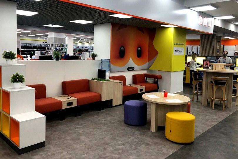 Після реформату та відповідно до нового стилю магазини стали світлими, яскравими, технологічними і зручними для вибору техніки. Фірмовий «хаб» (каси, зона видачі інтернет-замовлень з FOXTROT.UA, надання послуг з налаштування), комфортні лаунж і кредитна зони, дитячий «куточок» – все зроблено для того, щоб забезпечити новий рівень клієнтського досвіду.