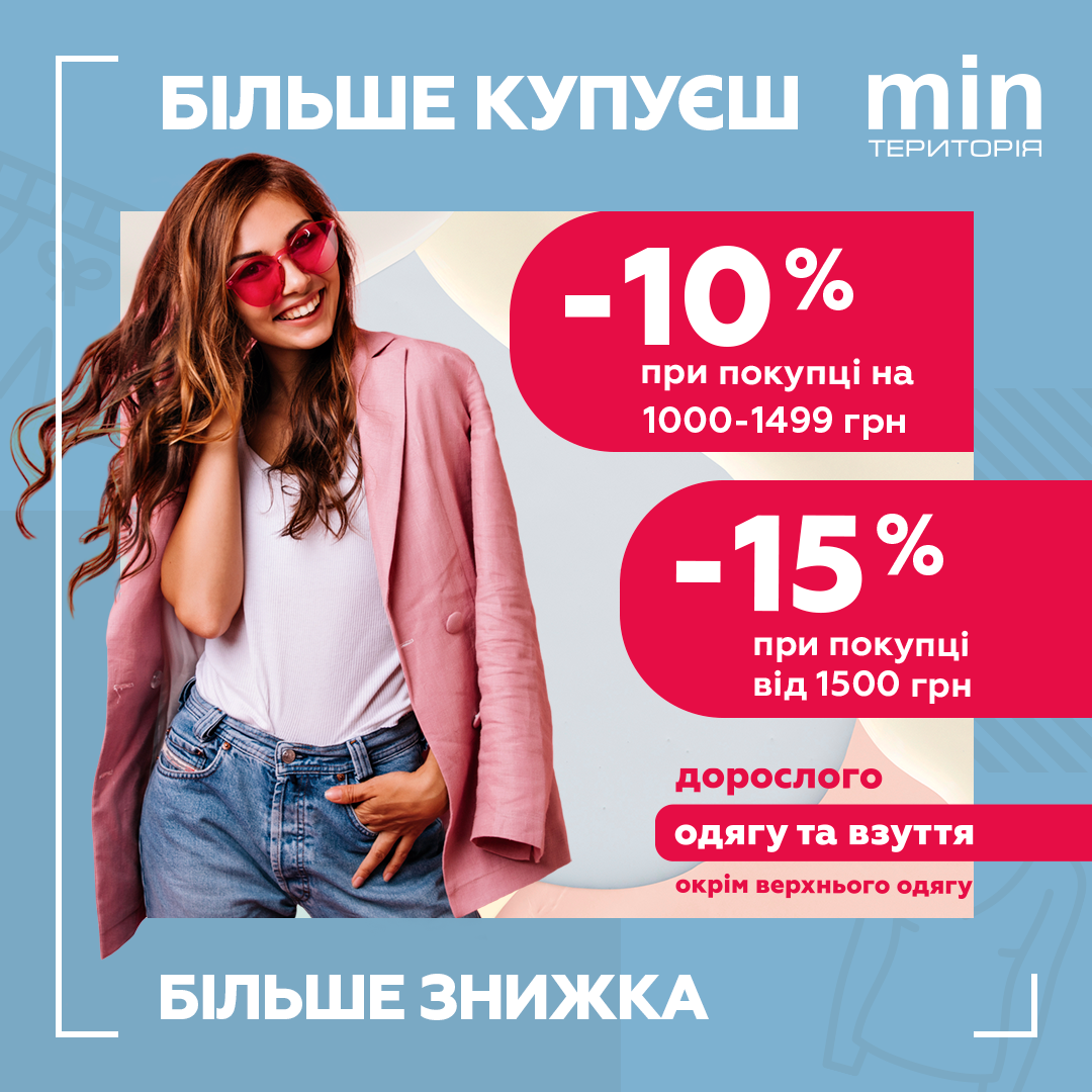 Аби зробити шопінг більш приємним, мережа оголосила про акцію з 13.03.2023 до 31.03.2023 на дорослий одяг та взуття. При покупці на 1000 грн ви отримуєте знижку -10% на суму чека, а при покупці на 1500 грн отримуєте знижку -15% на суму чека. Але будьте уважні: акція діє лише на одяг для дорослих, крім military одягу, верхнього одягу (куртки, жилетки, пальто, тренчі), та одягу вже зі знижкою. Плюсом, акція лише в шопінг-центрах Територія мінімальних цін, не діє на сайті.