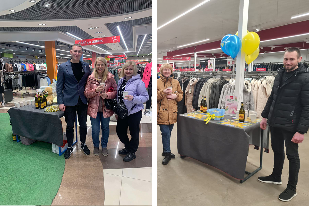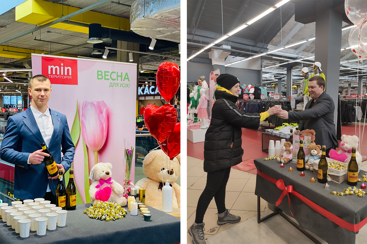 Головний сюрприз, який чекав покупців у шопінг-центрах Києва та Івано-Франківська – святковий стіл, де прекрасним дамам наливали шампанське та пригощали цукерками.