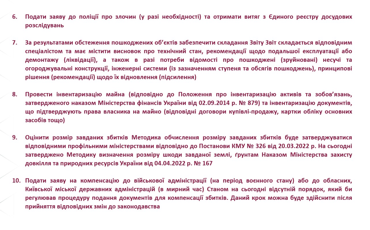 Нижче наведено 10 основних кроків, які треба пройти, аби зафіксувати пошкодження та отримати можливість на компенсацію збитків.