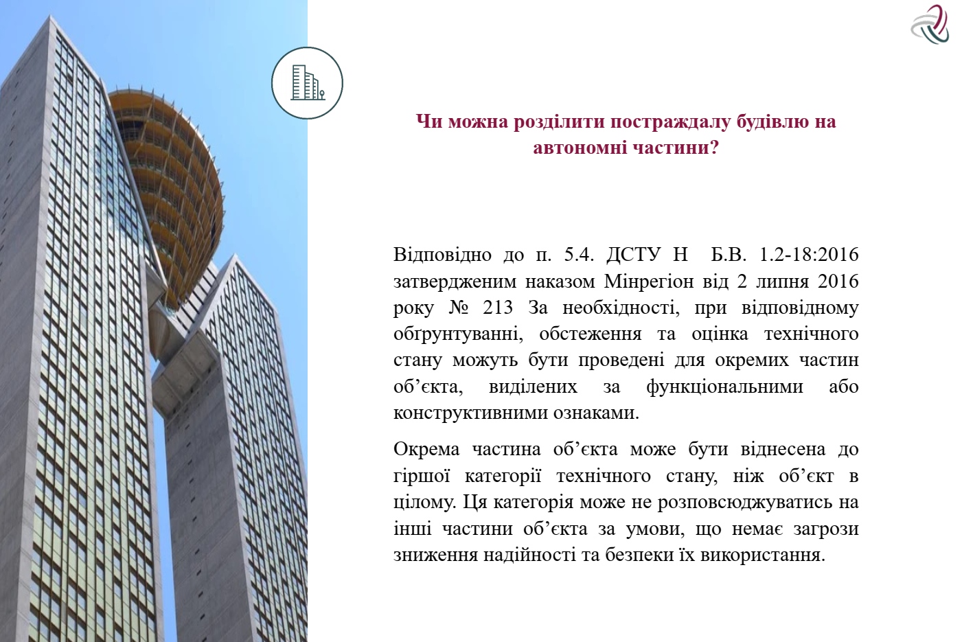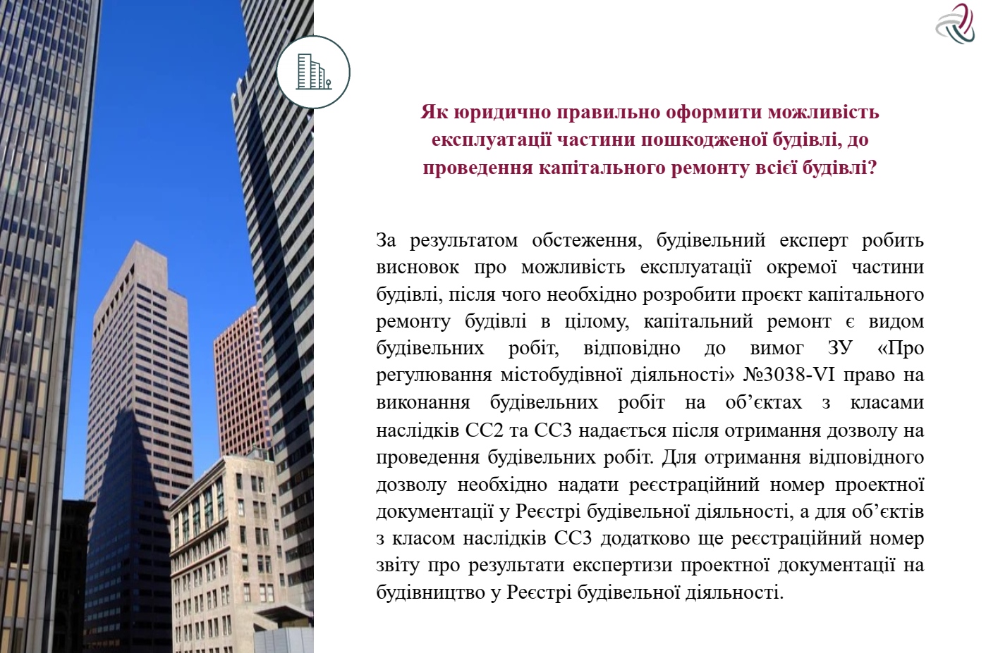 Допрацьоване під час війни законодавство покладає відповідальність за прийняття рішення про роботу частково зруйнованого об’єкту на будівельного експерта (з кваліфікаційним сертифікатом відповідного рівня) та власника будівлі. Відтак від прийнятого власником рішення що робити з будівлею залежить весь подальший процес роботи.