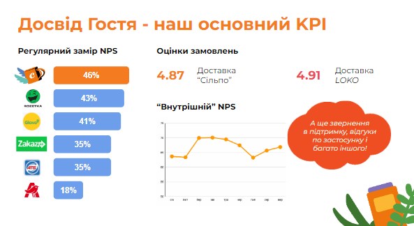 По-перше, раз на квартал ми заміряємо NPS різних служб доставки зовнішньою агенцією. По усередненим даним цього року, ми є однією з найулюбленіших доставок. Також збираємо оцінки по нашим замовленням, коментарі та звернення на гарячу лінію. Тут ми моментально створюємо тікети в наших внутрішніх системах і реагуємо: передзвонюємо, вибачаємося різними «сорі–бонусами» тощо. По всім метрикам у команди стоять цілі, бо нам потрібно, щоб гості нас любили ще більше. Зараз у нас 90% оцінок – це п’ятірки, але ми не зупиняємося.