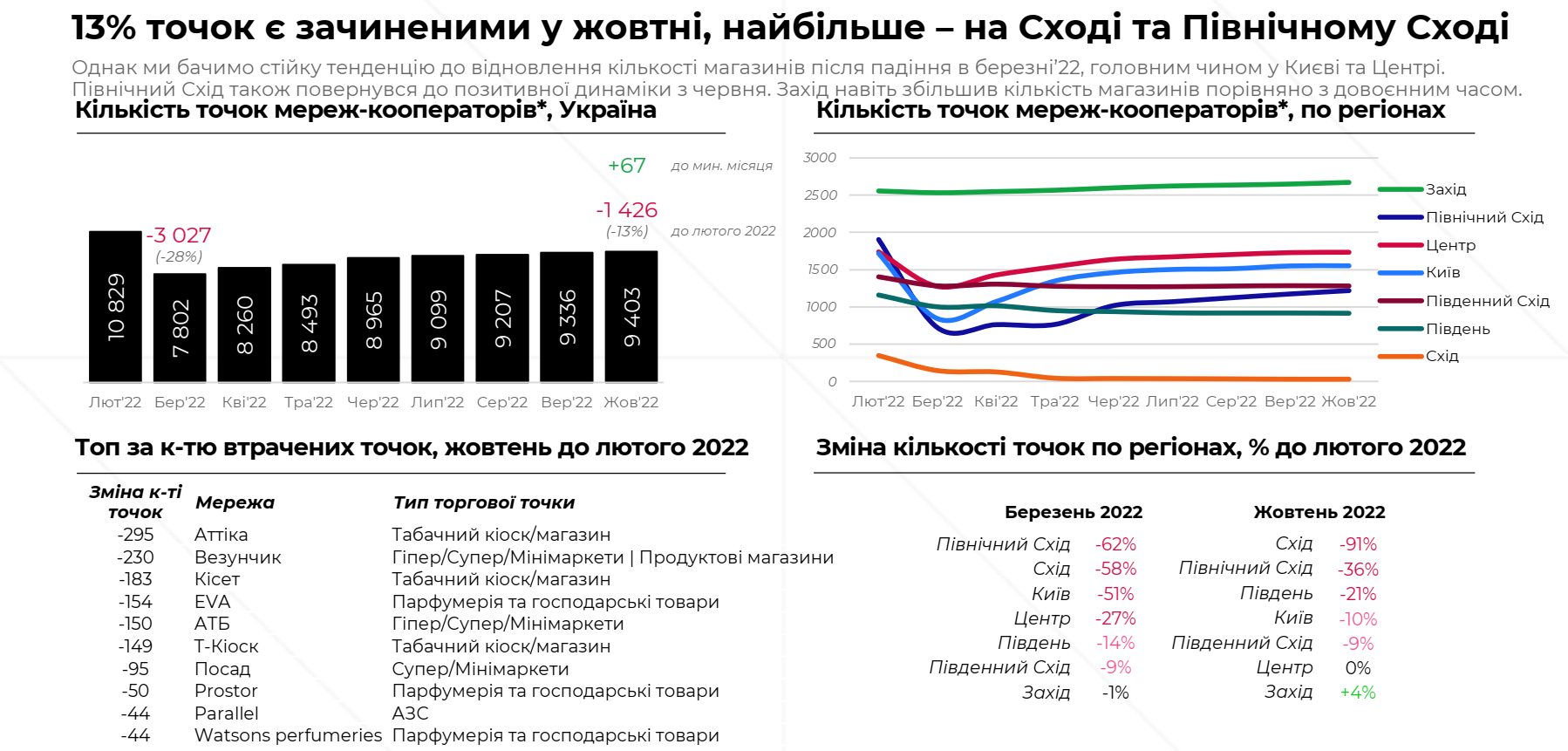 Найбільше таких точок виявилося на сході та півдні країни. Показовими є приклади мережі табачних кіосків/магазинів Аттіка, яка через війну втратила майже 300 точок, а також мережі продуктових магазинів Везунчик, що залишилася без 230 об’єктів (гіпер/супер/мінімаркети та продуктові магазини).