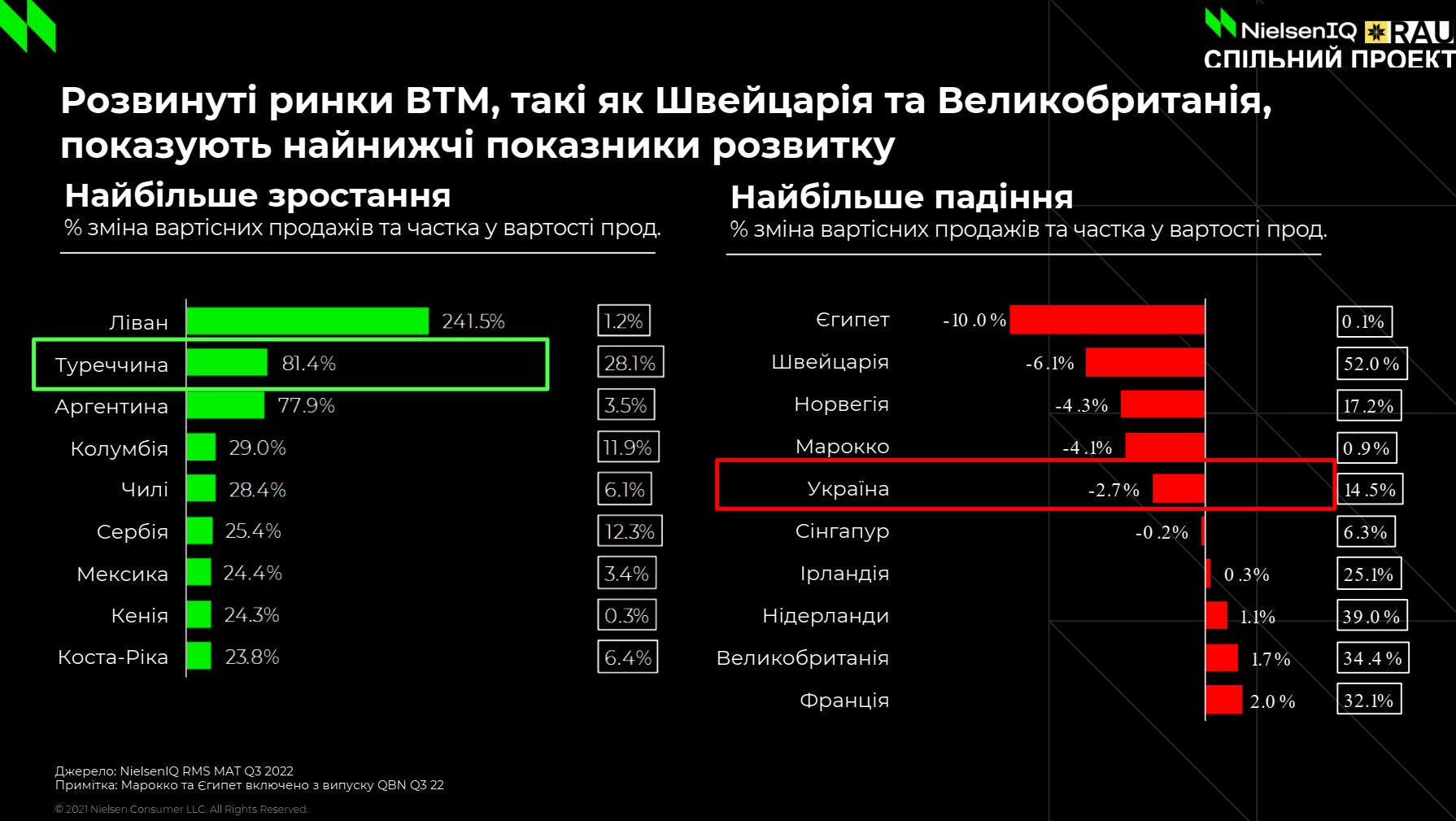 Цікаво також, що серед країн з високим рівнем інфляції Україна, незважаючи всі виклики, знаходиться не на першому місці по зростанню цін на FMCG-товари. Так, у Туреччині, де війни немає, інфляція товарів категорії FMCG перевищує 70% , обороти першої п’ятірки виробників зросли на 86% відносно минулого року. В Україні, де продуктова інфляція більше 28%, продажі першої п’ятірки скоротилися у грошовому виразі на 2%. Так само виділяються на загальному фоні Угорщина та Казахстан.