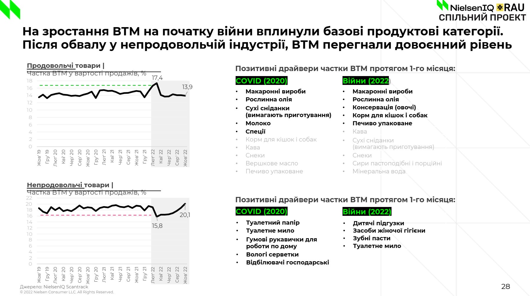 При цьому добре видно, як відрізняється по деяких товарних позиціях споживання ВТМ на початку пандемії (березень 2020 року) та на початку війни (березень 2022 року). Якщо по продуктових категоріях все більш-менш співпадає (макарони, олія та сухі сніданки чи консерви й т. п.), то по non-food категоріях помітні відмінності. Зокрема, якщо під час Covid-19 на першому місці були засоби захисту і туалетний папір, а вже під час війни першочергово скупали дитячі підгузки та засоби гігієни.