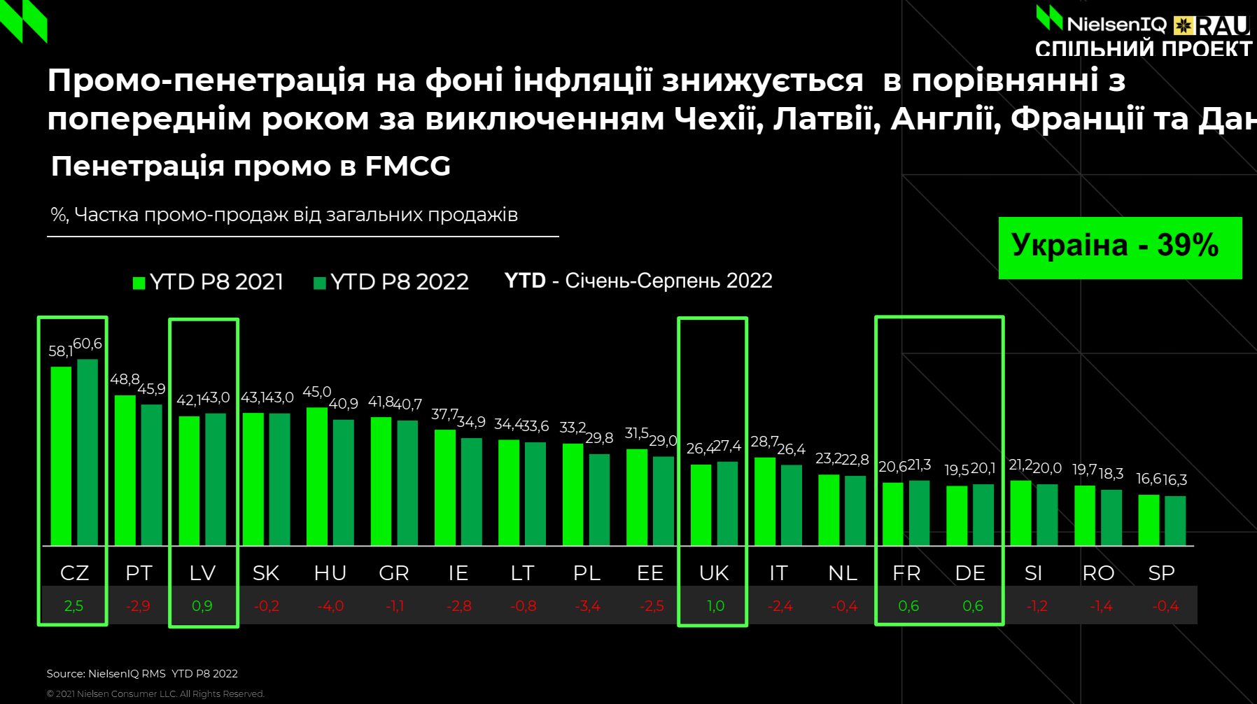 На початок третього кварталу 2022 року зростання цін стало двозначним в Європі уперше за десятки років. Відповідно споживачі активно шукають акційні пропозиції. Так, наприклад, в Чехії частка промо-продажів склала в січні-серпні 2022 року більше 60% від загального об’єму торгівлі. Так само ростуть промо-продажі в Латвії, Великобританії, Франції та Данії. В Україні цей показник становить 39%. Тут мова йде про будь-які види акцій, а не тільки цінові знижки.