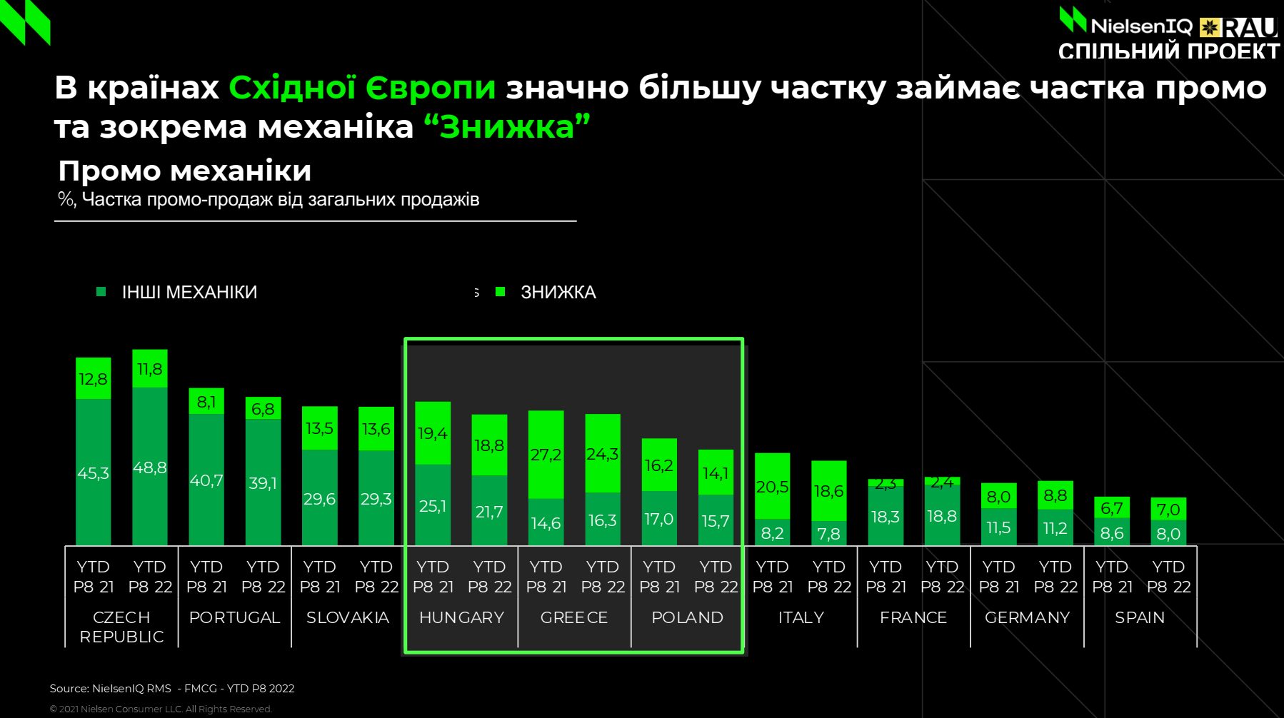 Проте якщо розглянути різні механіки промо, буде добре видно, що в країнах Східної Європи значно більшу частку займає частка промо, та зокрема механіка «Знижка». Це добре видно на прикладі Угорщини, Греції та Польщі. В окремих категоріях товарів частка промо-продажів перевищує 70%, як, наприклад, напої в Чехії.