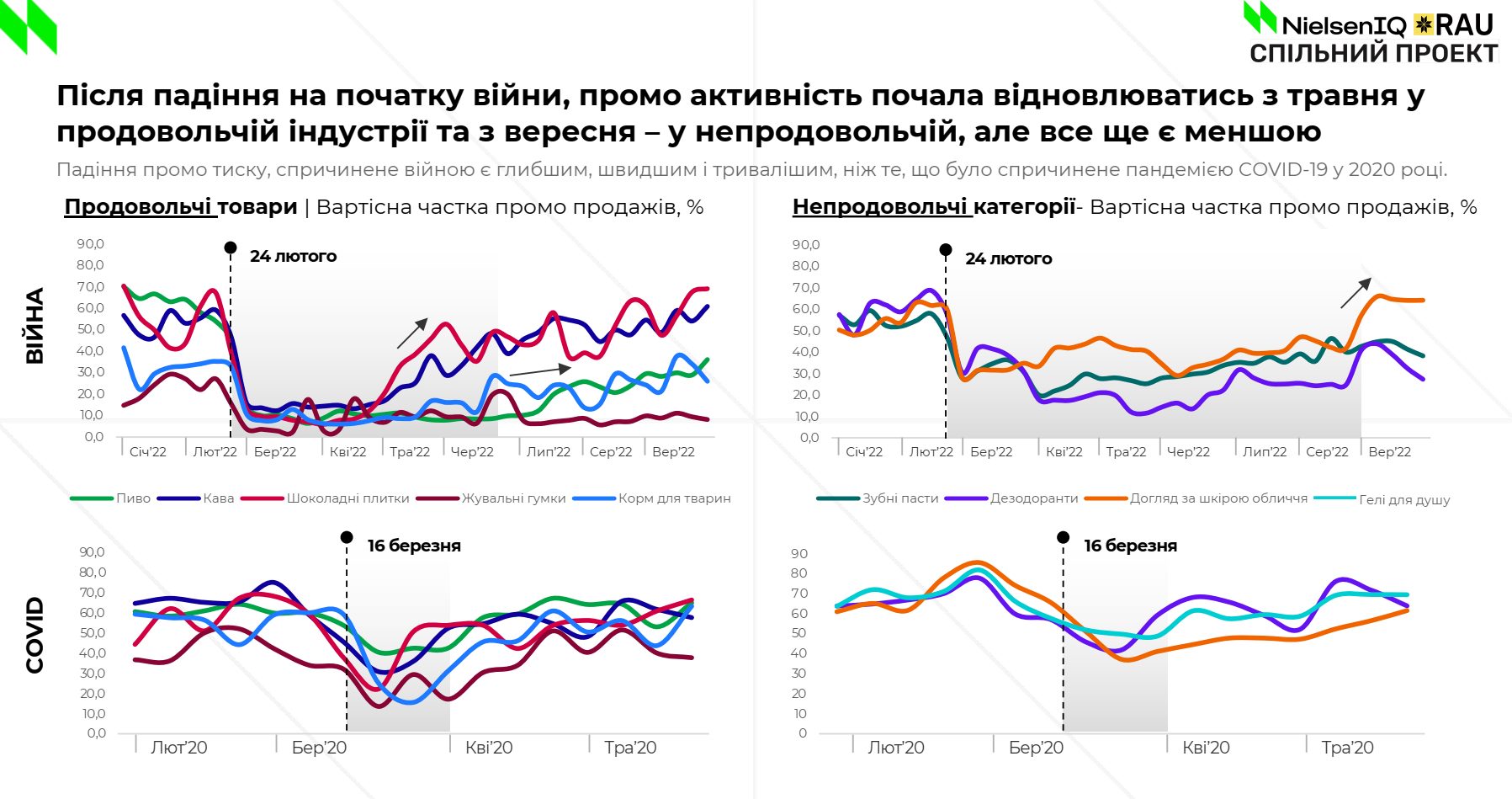 Якщо так само порівнювати продажі в пандемію та під час війни в Україні, добре видно що після 24 лютого всі забули про будь які акції (а деякі постачальник й про свої контрактні зобов’язання). Повернення частки продажів через промо в продовольчій групі товарів почалося лише з травня, а помітне зростання в non-food категоріях – лише з вересня.