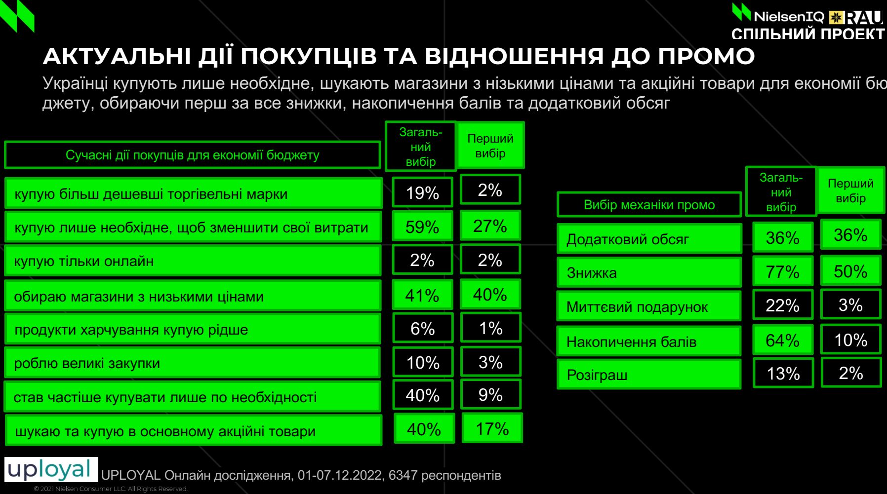 Згідно з даними опитування майже 7000 споживачів, проведеного компанією Uployal, 59% українців купують лише найнеобхідніше, аби зменшити свої витрати. Причому приблизно третина назвали це в першу чергу. Важливо також, що із 41% тих, хто вибирає магазини із більш низькими цінами майже стільки ж (40%) зробили це своїм першим вибором. Тобто першочергове завдання для вітчизняних ритейлерів – створити враження магазину із доступними (читай – низькими) цінами на товари. Тому що все інше – вторинне.