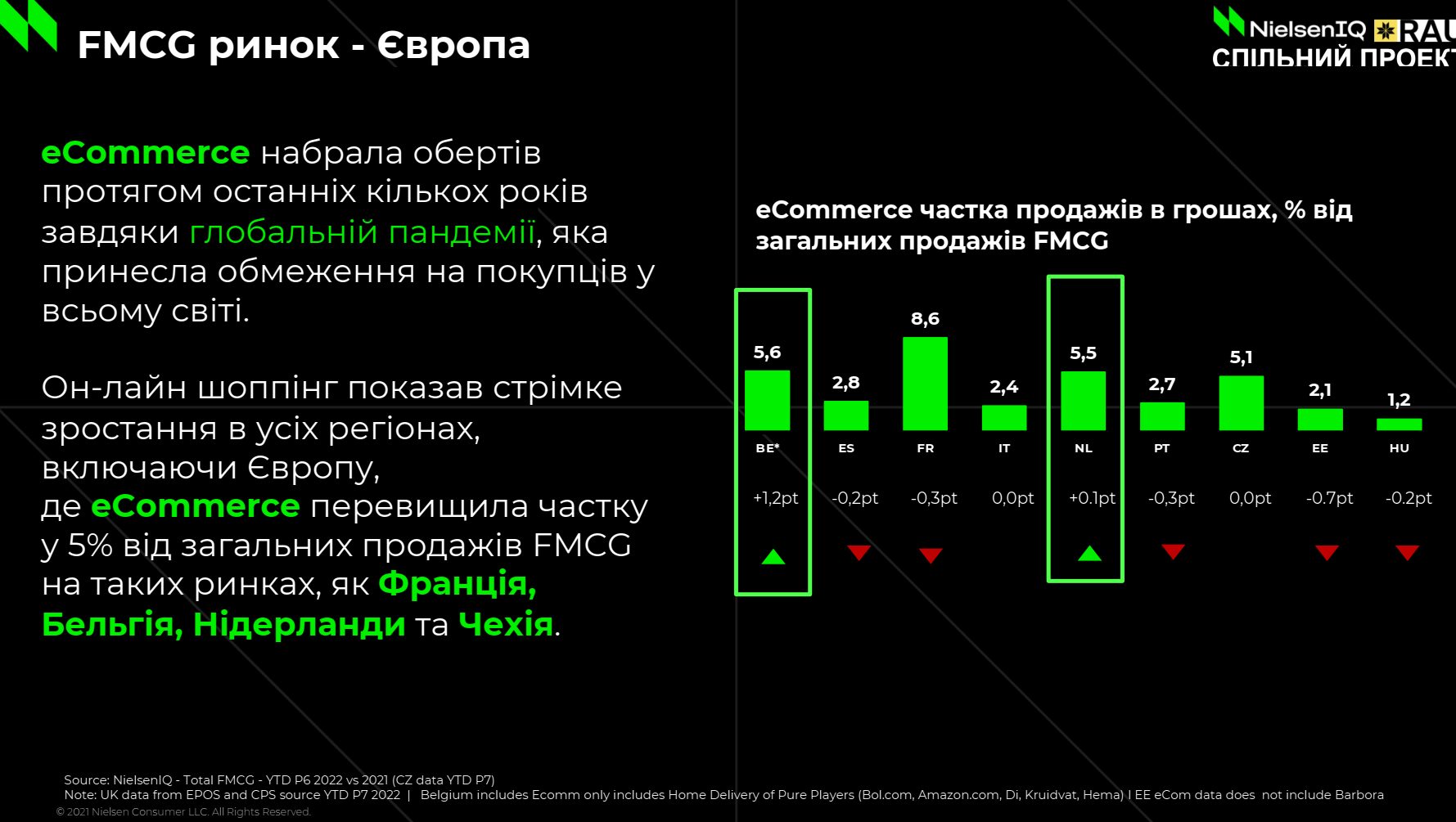 Онлайн-канал продажів також сприймається як більш вигідний для покупок. Онлайн-шопінг показав стрімке зростання в усіх регіонах, включаючи Європу, де e-commerce перевищила частку у 5% від загальних продажів FMCG на таких ринках, як Франція, Бельгія, Нідерланди та Чехія.