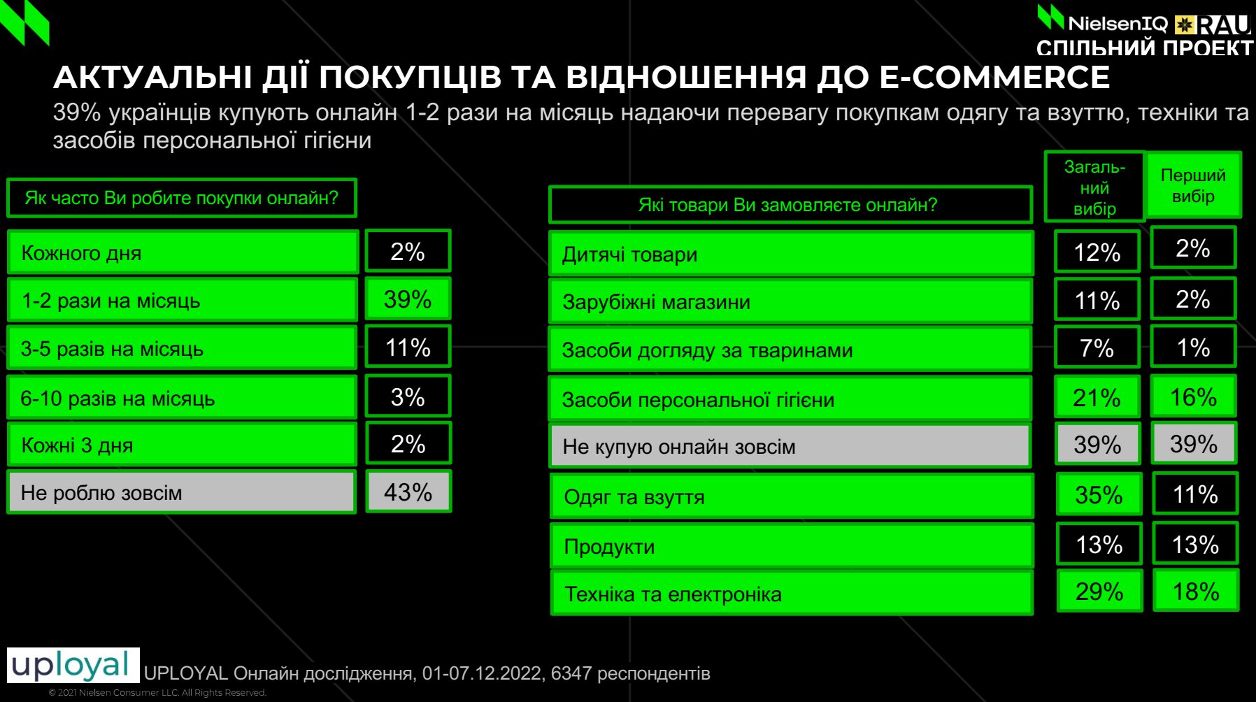 В той же час 39% українців купують онлайн 1-2 рази на місяць, надаючи перевагу покупкам одягу та взуття, техніки та засобів персональної гігієни. Але так само 39% споживачів не купують в інтернеті зовсім нічого. І тут важливу роль у розвитку онлайн торгівлі відіграють такі мережі як EVA, Watsons, Makeup та інші.