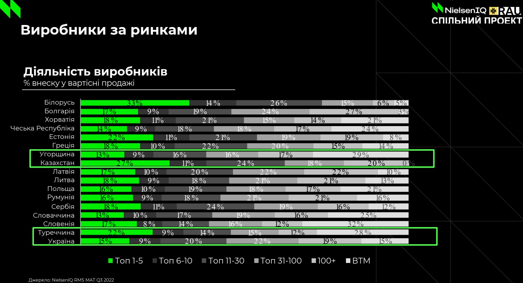 В структуру продажів війна теж внесла свої корективи. На діаграмі видно, що в Україні досить рівномірний розподіл між різними за «вагою» на ринку виробниками. Натомість у Казахстані топ-5 виробників мають частку у 27% всього виторгу категорій FMCG в країні, у Туреччині – 22%. Так само доля власних торгових марок в Угорщині становить 29%, а в Туреччині – 28%. Натомість в Україні топ-5 виробників і ВТМ займають лише по 15%.